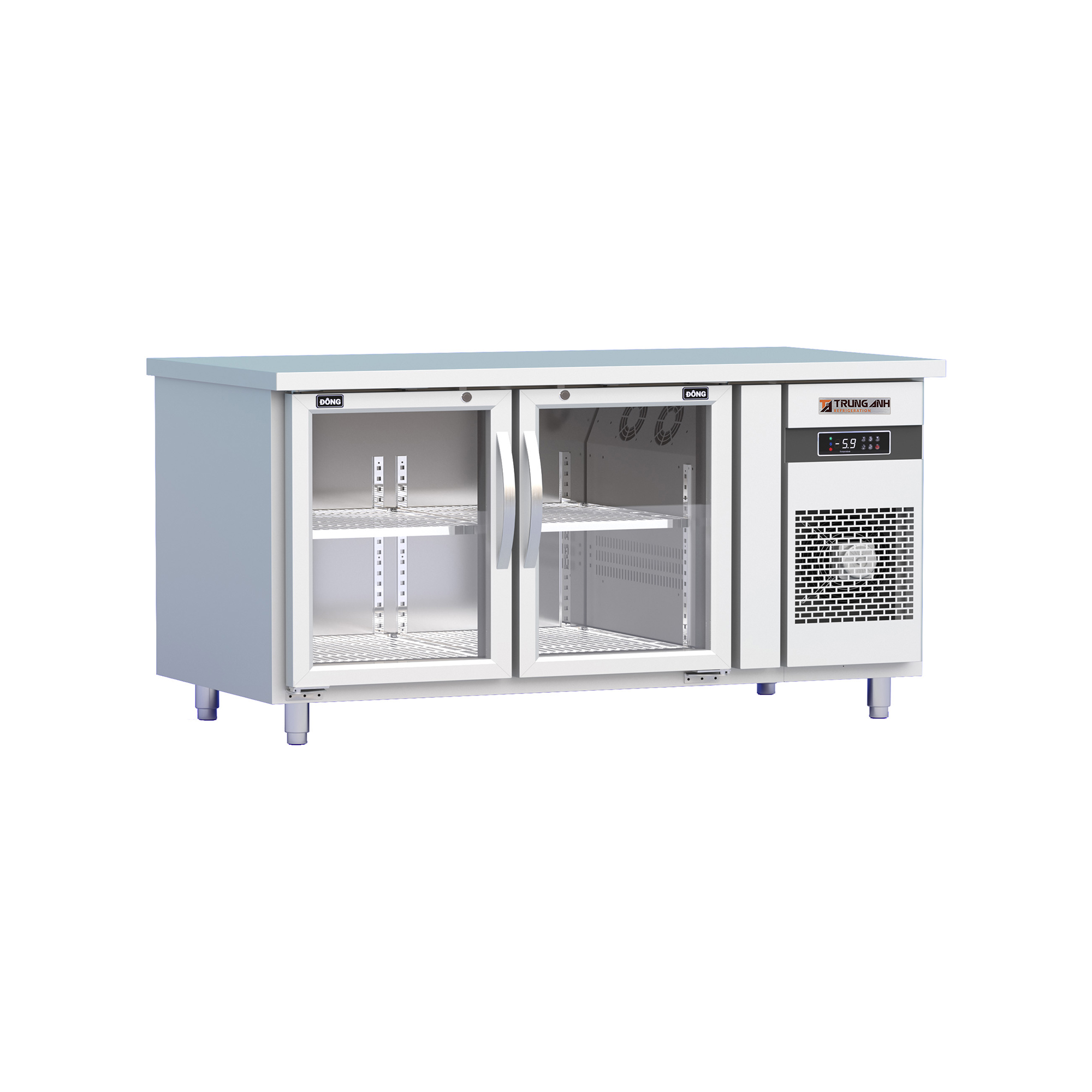 Tủ bàn đông quạt gió 2 cánh mở kính 1500x760x845mm là mẫu tủ bảo quản thực phẩm công nghiệp phục vụ vận hành ở chế độ đông, thiết kế tủ bàn với cánh mở phía trước, cho phép thao tác sơ chế ngay trên mặt bàn. Sản phẩm sở hữu hệ thống nan giá inox đa tầng thuận tiện cho việc sắp xếp, trưng bày thực phẩm, nước uống.