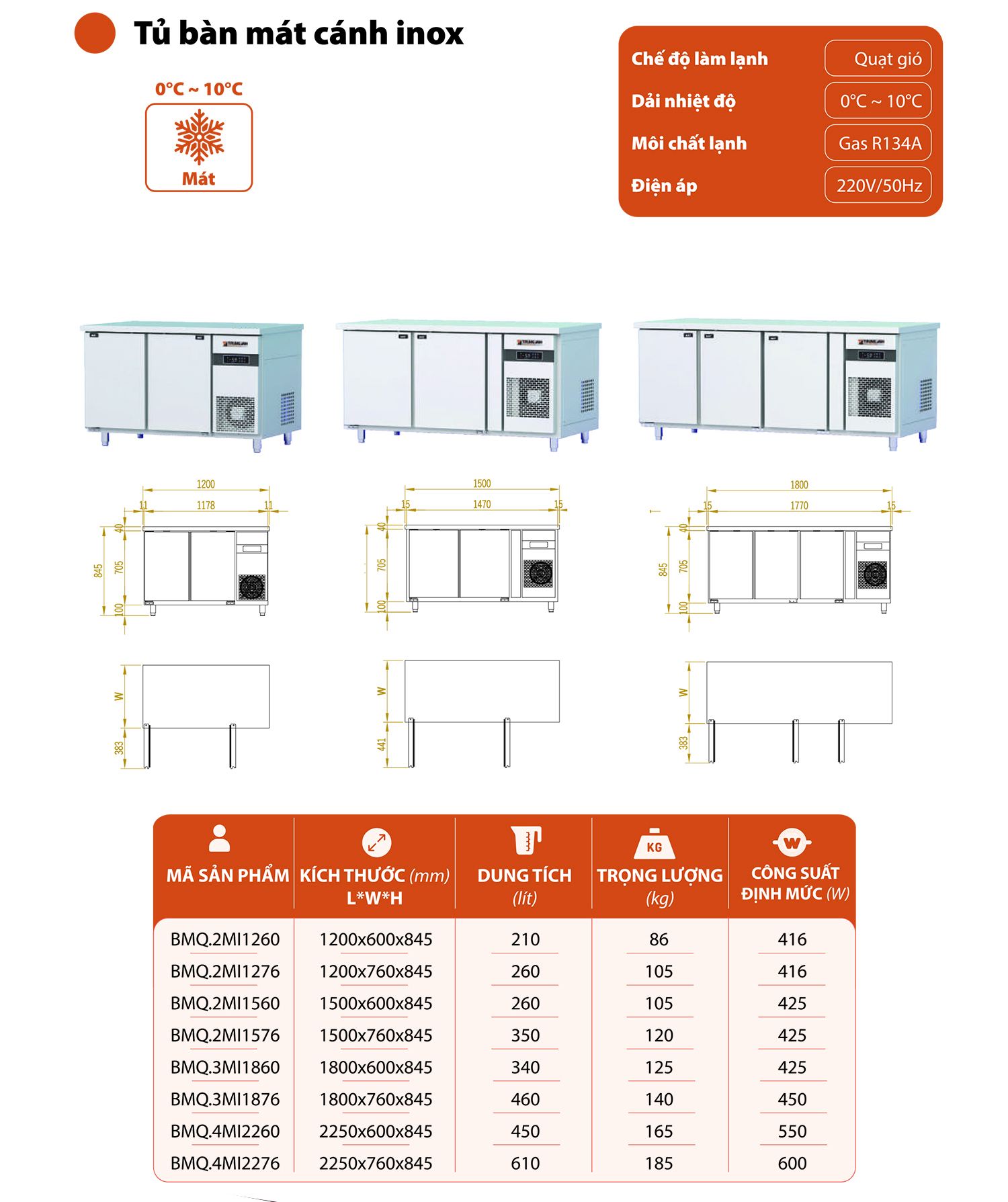 – Tủ bàn mát quạt gió 3 cánh mở inox 1800x760x845 (BMQ.3MI1876);