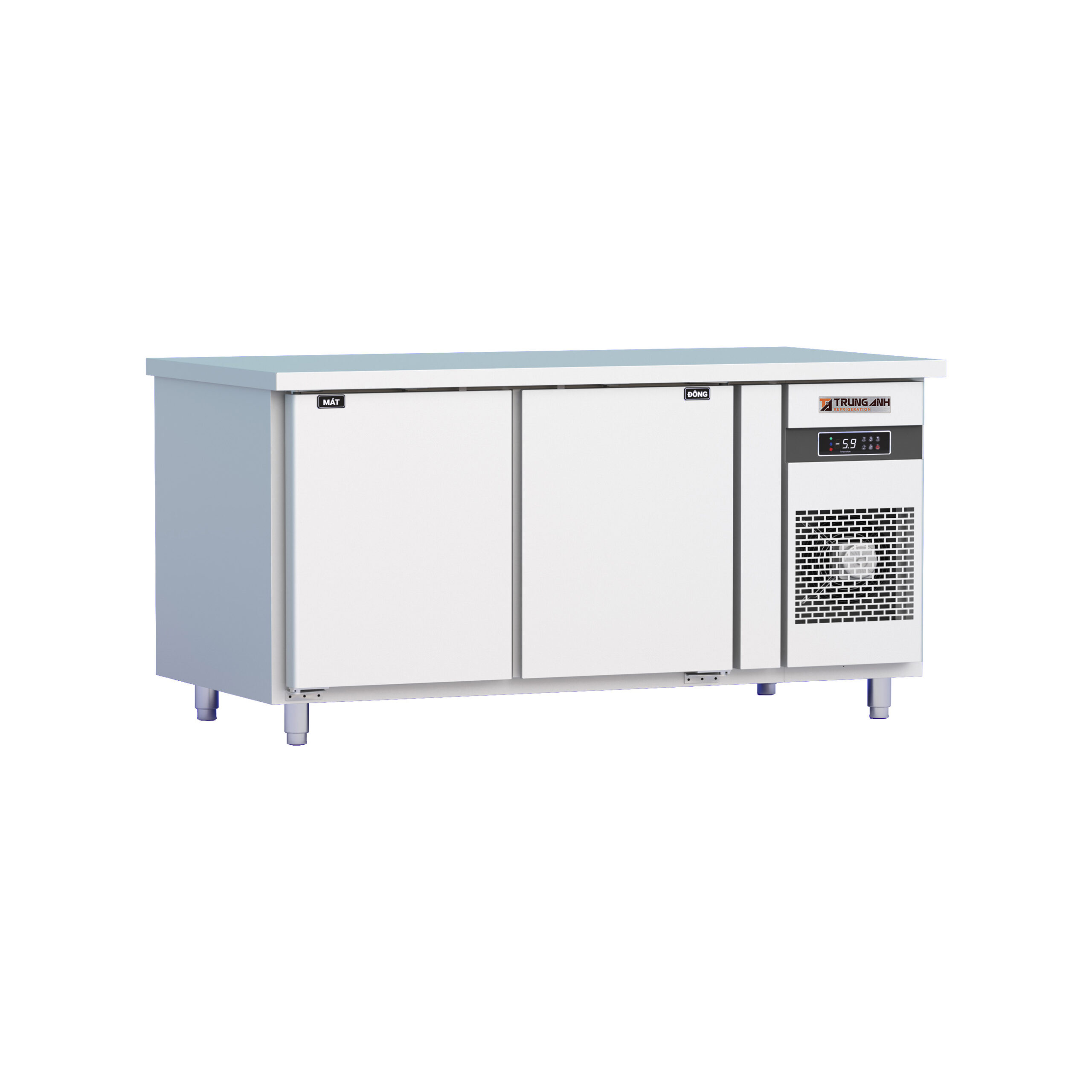 Tủ bàn Đông-Mát quạt gió 2 cánh inox 1500*600*845 là thiết bị bảo quản thực phẩm tích hợp 2 chế độ Đông và Mát. Thiết kế tủ bàn có 2 cánh mở phía trước giúp người dùng thuận tiện phân loại, cất trữ và thao tác lấy thực phẩm dễ dàng, nhanh chóng.
