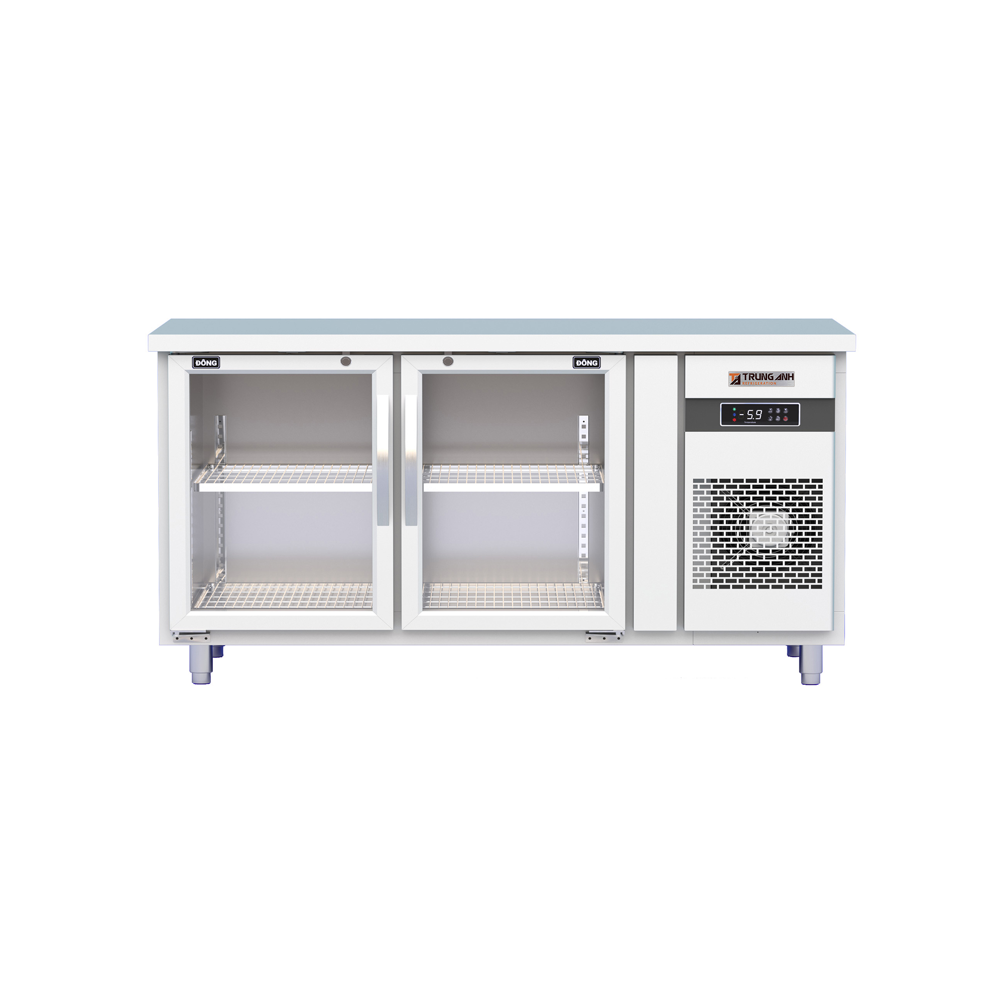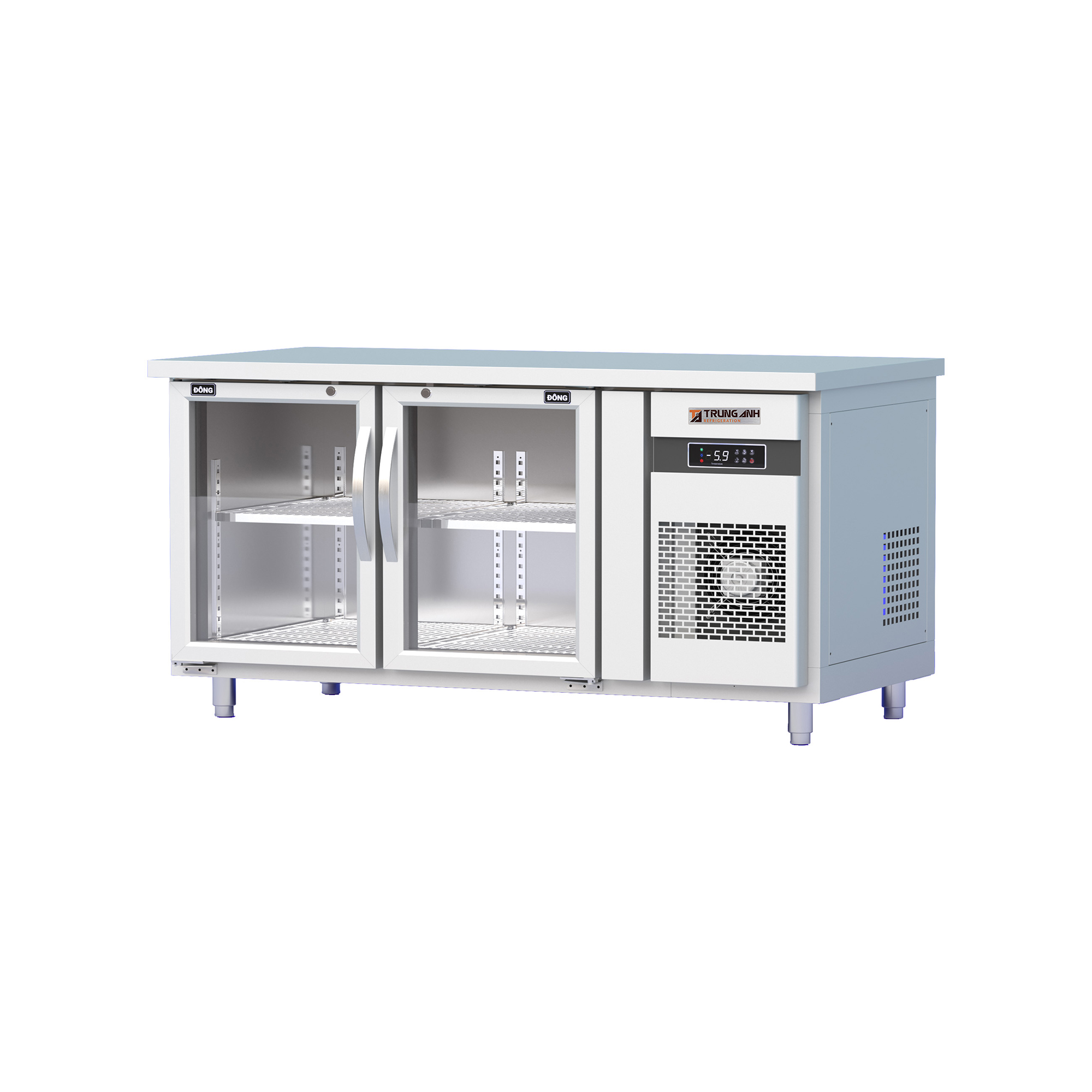 Tủ bàn đông quạt gió 2 cánh mở kính 1500x760x845mm là mẫu tủ bảo quản thực phẩm công nghiệp phục vụ vận hành ở chế độ đông, thiết kế tủ bàn với cánh mở phía trước, cho phép thao tác sơ chế ngay trên mặt bàn. Sản phẩm sở hữu hệ thống nan giá inox đa tầng thuận tiện cho việc sắp xếp, trưng bày thực phẩm, nước uống.